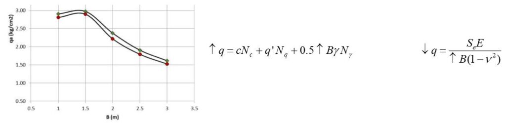 در تعیین ظرفیت باربری مجاز خاک، در صورتی که معیار گسیختگی برشی حاکم شود، با افزایش عرض نوار (B) مقدار qall افزایش می یابد. اما در صورتی که معیار نشست مجاز حاکم گردد، با افزایش B مقدار qall کاهش خواهد یافت. برای مثال در نمودار زیر در محدوده B = 1m تا B = 1.5 m معیار گسیختگی برشی حاکم بوده و برای B > 1.5 m معیار نشست حاکم شده است.