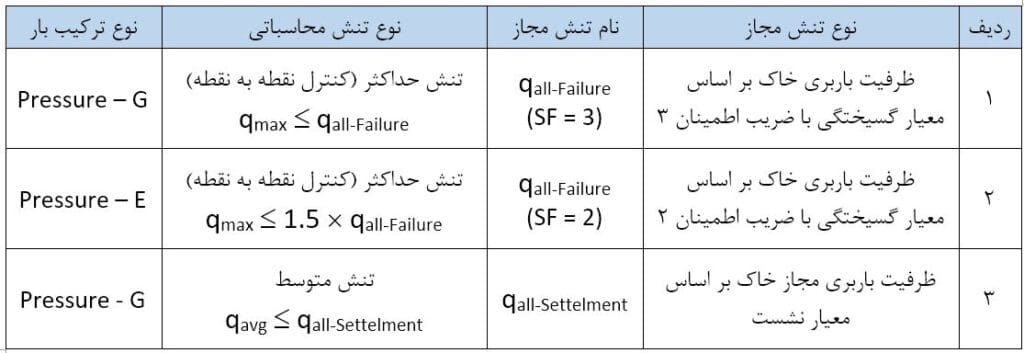 حداکثر تنش فشاری در فونداسیون را باید با مقدار ظرفیت باربری مجاز خاک مقایسه کرد. برای این منظور باید دو حالت استاتیکی و لرزه ای را به صورت جداگانه بررسی کنیم. ظرفیت باربری مجاز خاک نیز از دو معیار گسیختگی برشی و نشست مجاز به دست می‌آید.