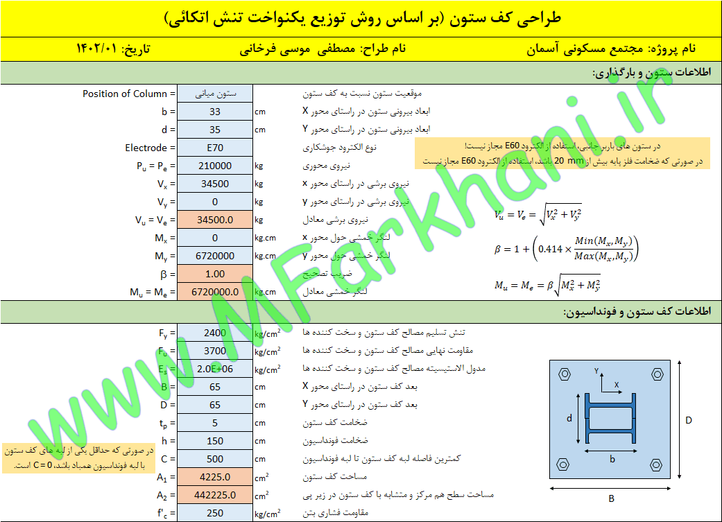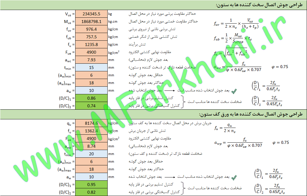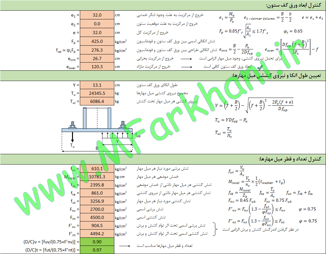 نمایش تمامی فرمول های به کار رفته در فرایند طراحی کف ستون