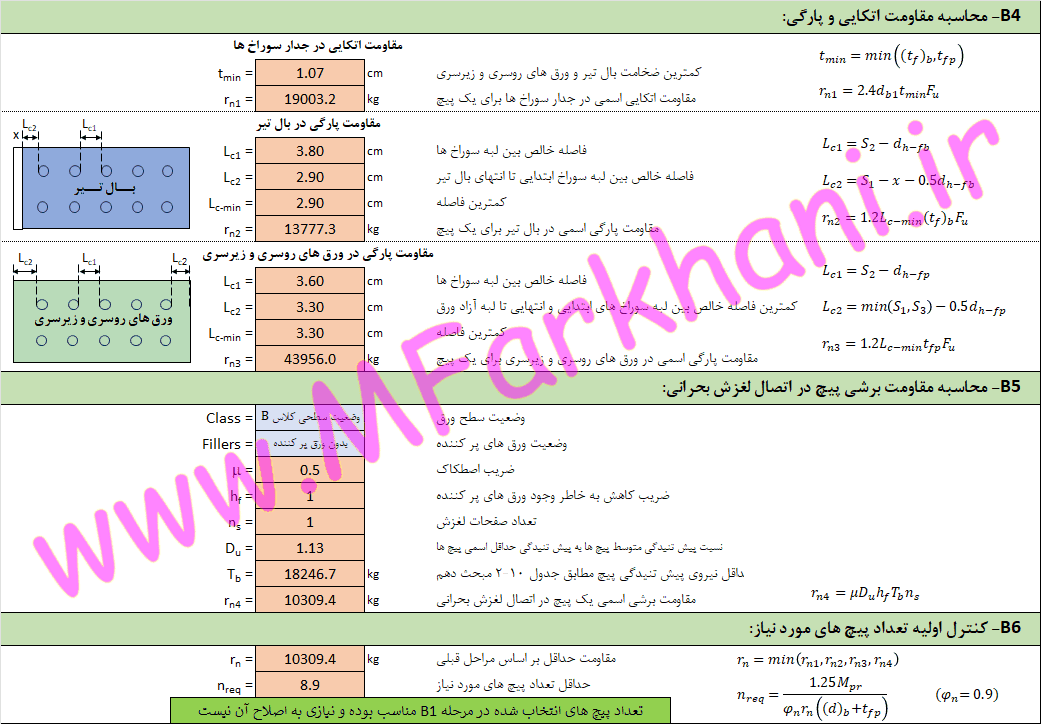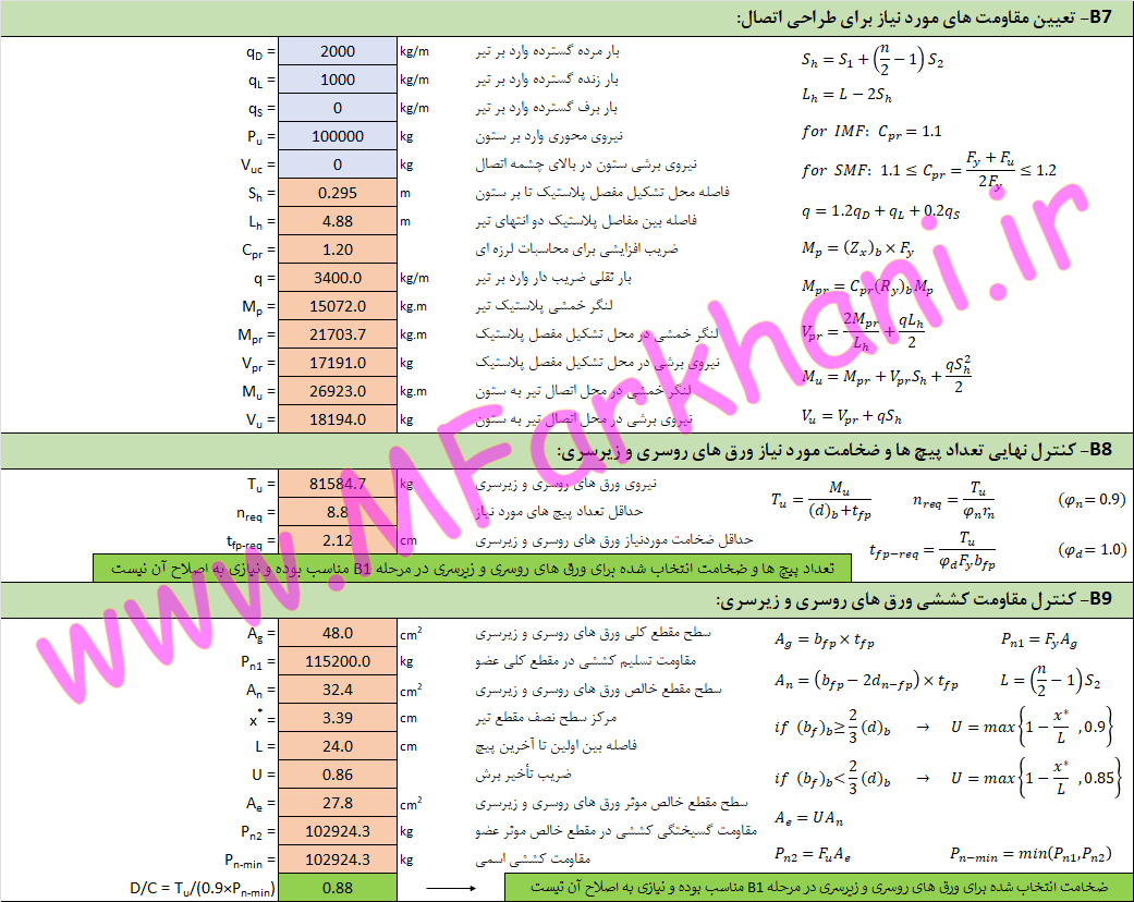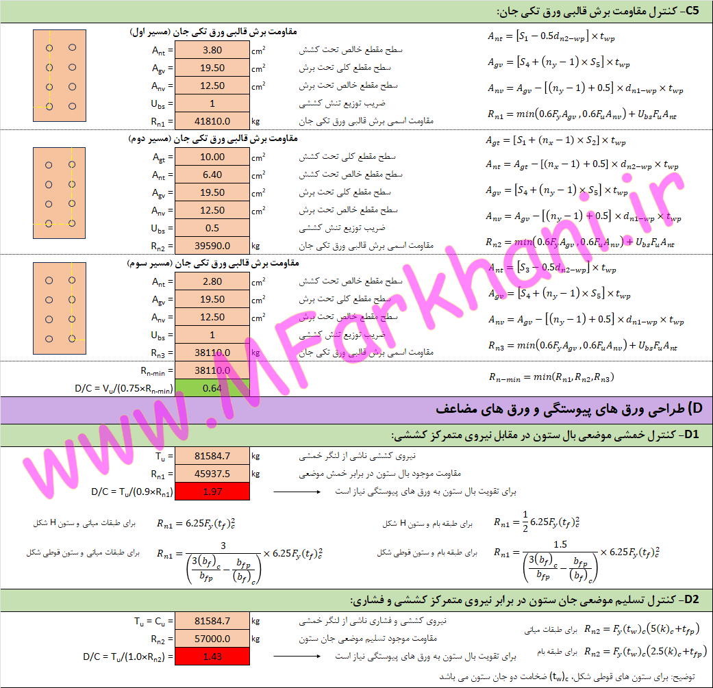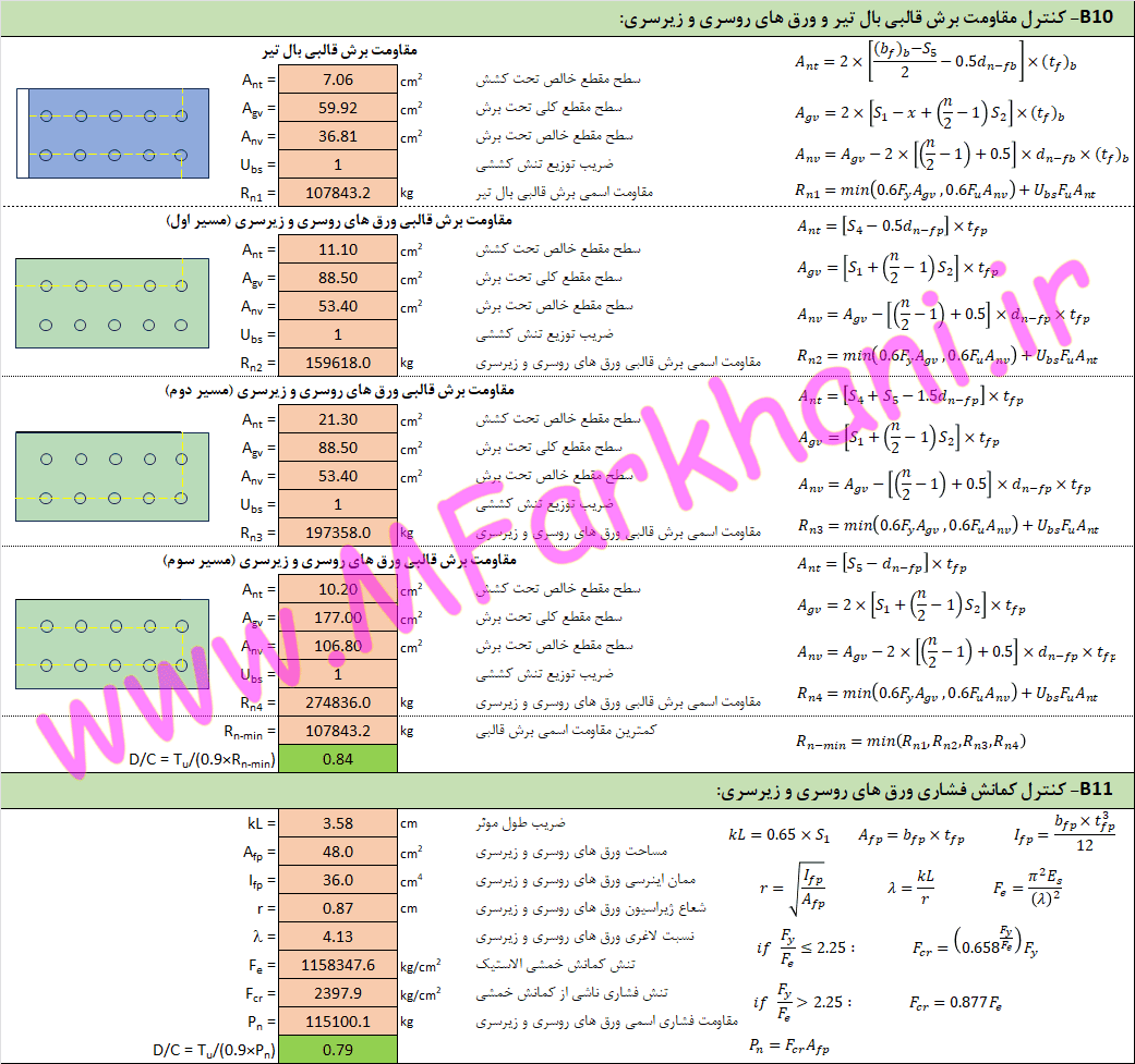 نمایش تمامی فرمول های به کار رفته در فرایند طراحی اتصال گیردار پیچی با ورق روسری و زیرسری