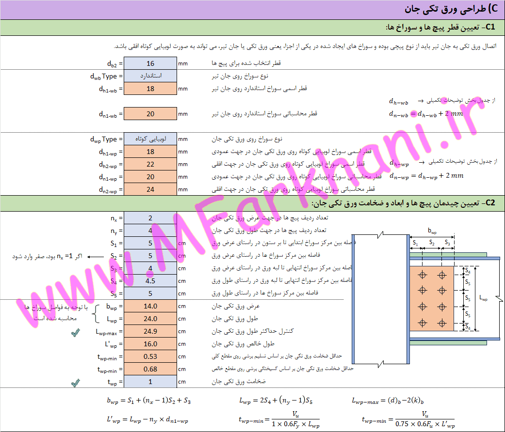تعیین چیدمان پیچ ها و ابعاد و ضخامت ورق تکی جان
