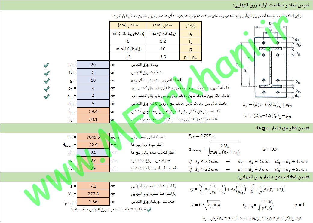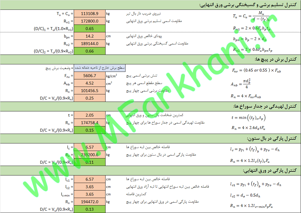 نمایش تمامی فرمول های به کار رفته در فرایند طراحی اتصال فلنجی یا ورق انتهایی چهار پیچی